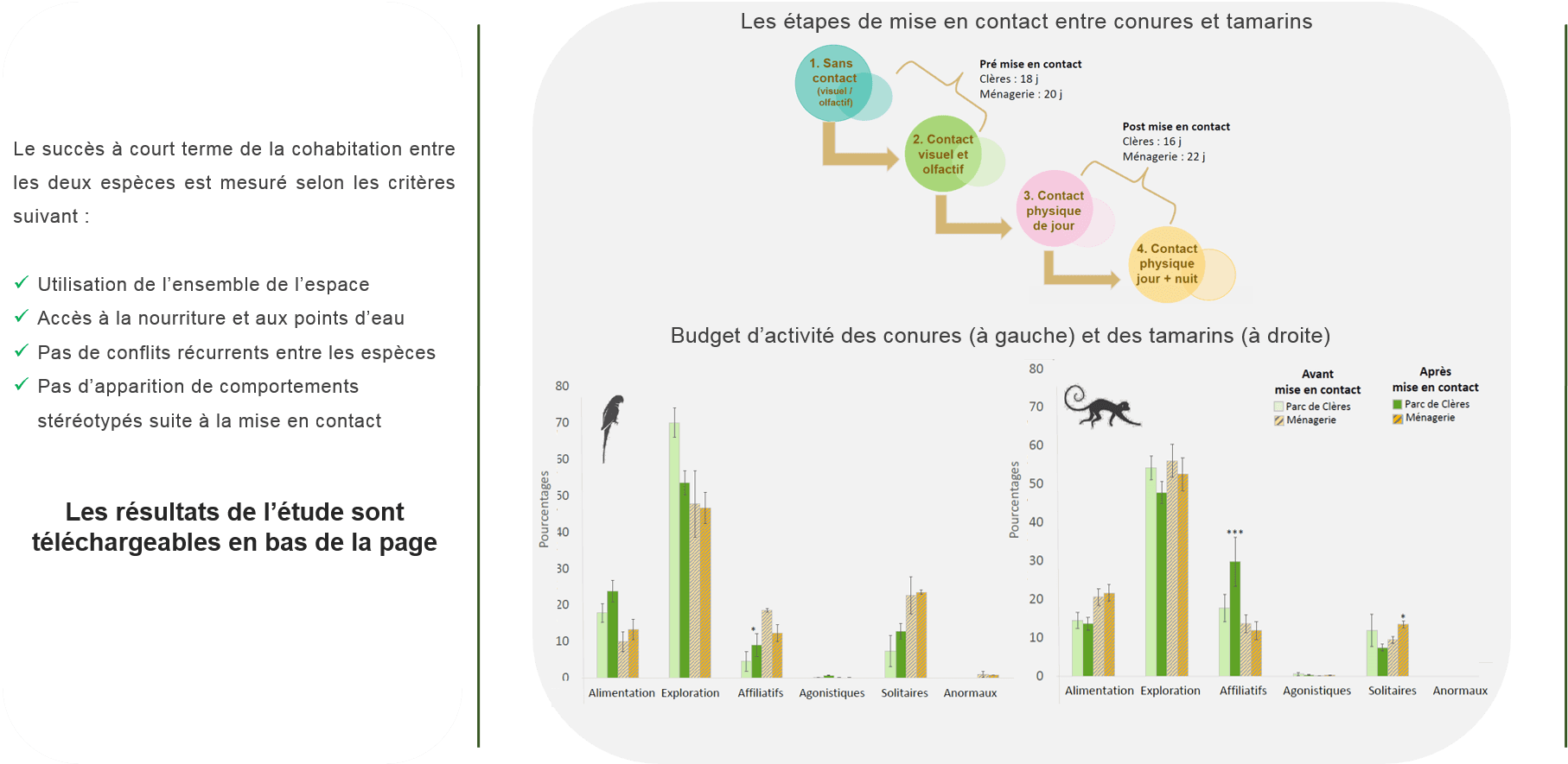 A cette fin, deux études comportementales ont été réalisées, l’une au Parc de Clères et l’autre à la Ménagerie du Jardin des Plantes (MNHN). La première concernait la cohabitation des conures avec un groupe de tamarins empereurs (Saguinus imperator), la seconde avec un groupe de tamarin-lion doré (Leontopithecus rosalia).
